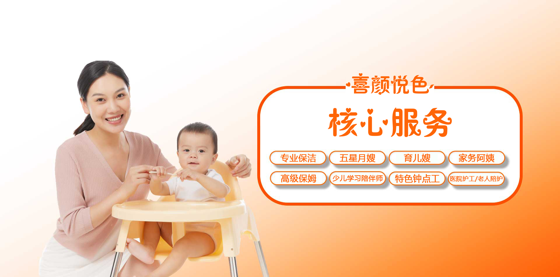 喜颜悦色是家政行业的新锐品牌,主要面向客户提供安全、专业的母婴护理、育婴育儿、高端保姆、病患护理、老年照护、保洁清洁等综合性家政服务。喜颜悦色家政重品牌,讲诚信,用责任心做事、用感恩心做人,对所有家庭服务人员进行严格把关、系统培训和跟踪服务 为每一位客户提供高素质、高技能并且安心、放心、舒心的人员。我们的目标是:为您解决后顾之忧,解放您的双手、放飞您的时间。公司依托先审核再培训,不培训不入户的标准化服务理念,为各类客户提供了高品质的服务,让客户真正的“喜颜悦色”!